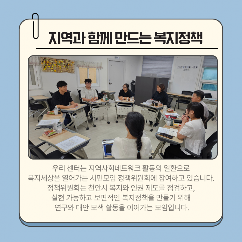 저희 센터에서는 복지세상을 열어가는 시민모임 정책위원회 2025-8차 회의에 참여하여 2025년 추진사항을 점검하고 지역 복지·인권 정책의 과제와 대안을 모색했습니다.