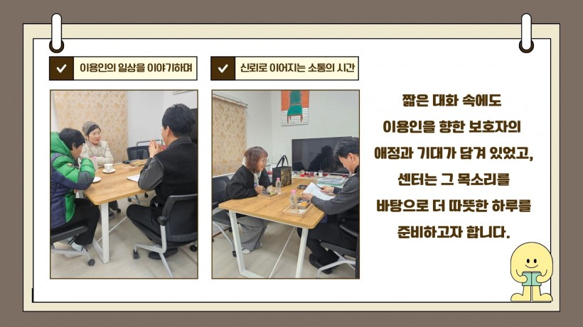 앞으로도 보호자와의 지속적인 소통을 바탕으로 이용인의 안정적인 이용과 건강한 일상을 함께 만들어가겠습니다.